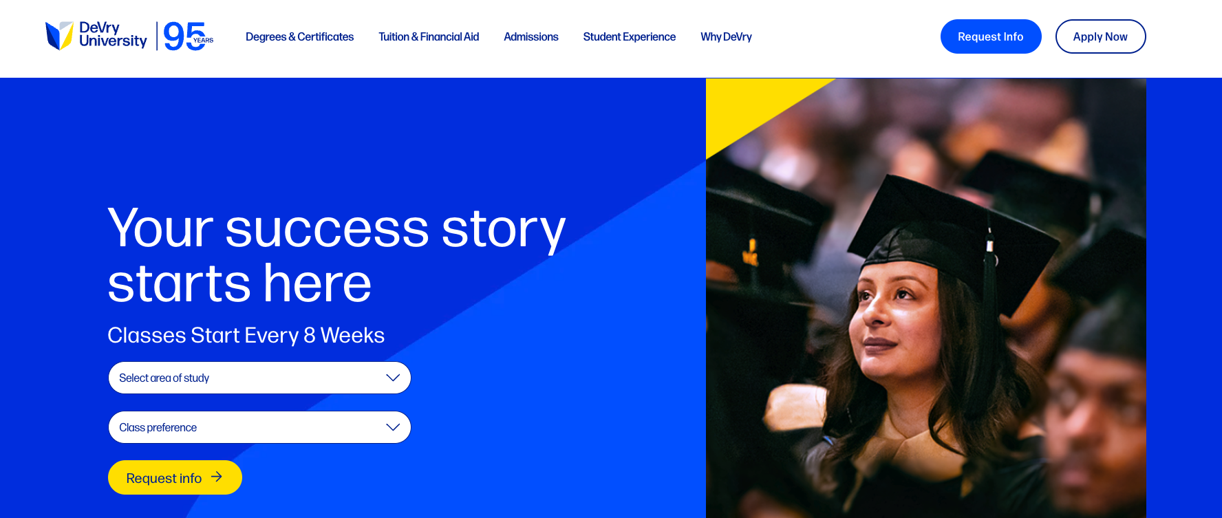 Prospective students faced a confusing process with a single form requiring nearly 20 fields, multiple distractions, competing navigation, and no clear path forward. The result was extreme abandonment before students could even determine if DeVry was right for them.