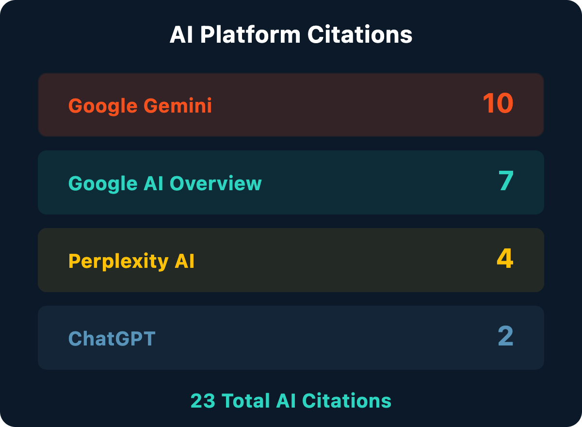 TDMC’s content is already being cited across major AI platforms: Google Gemini (10 citations), Google AI Overview (7), Perplexity AI (4), and ChatGPT (2). When patients ask AI assistants about pregnancy and oral health, dental infections and blood pressure, or oral-systemic connections, TDMC shows up as the source. That matters because AI-powered search is growing fast, and the sites getting cited now are building an advantage that’s hard to replicate later.