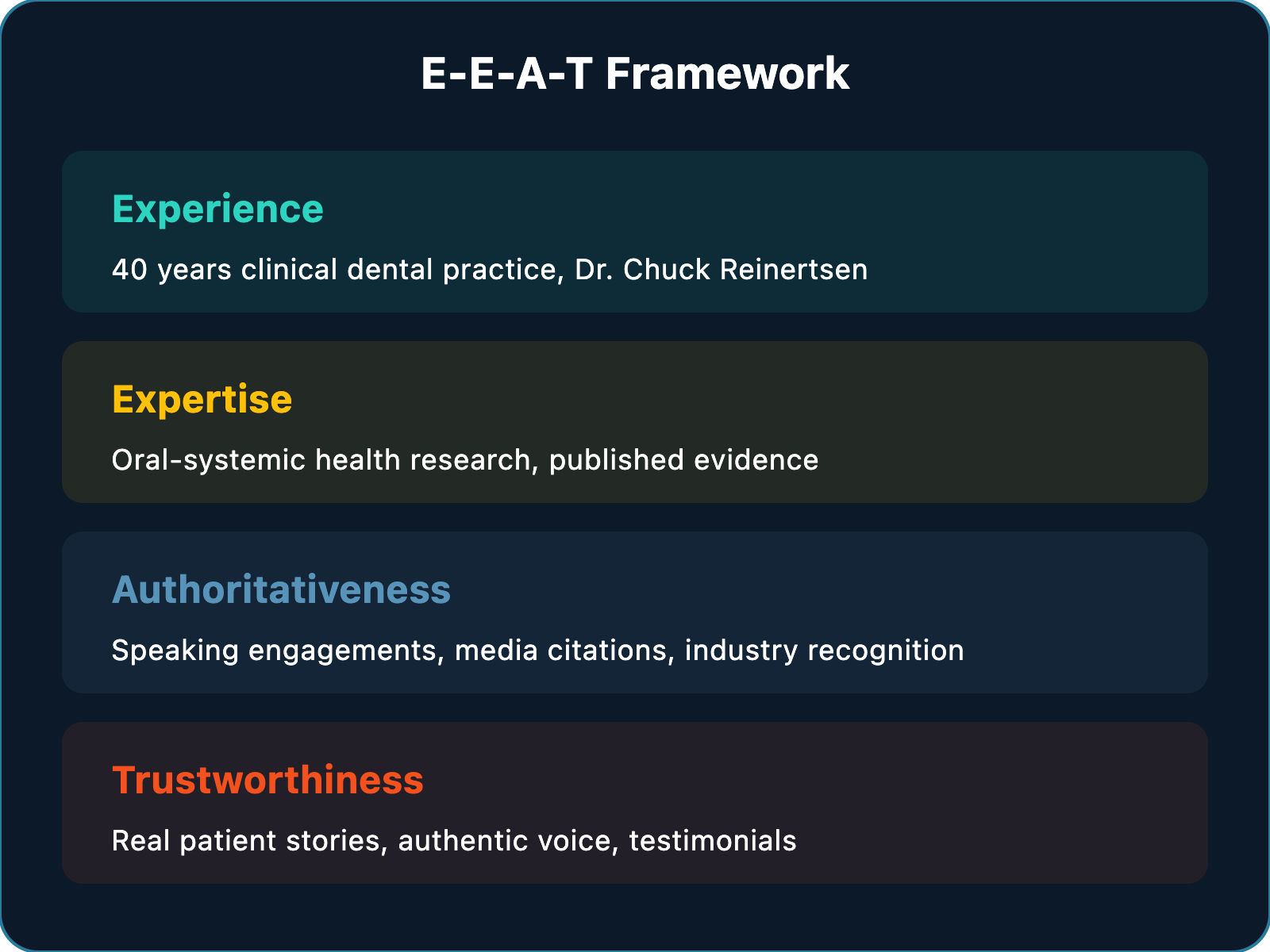 Each cluster paired a landing page with 10-15 blog articles targeting real patient questions like “mouthwash safe during pregnancy” and “broken tooth while pregnant.” We layered in YouTube videos with Dr. Chuck, downloadable PDF guides, a brand messaging framework, and E-E-A-T optimization across the board.