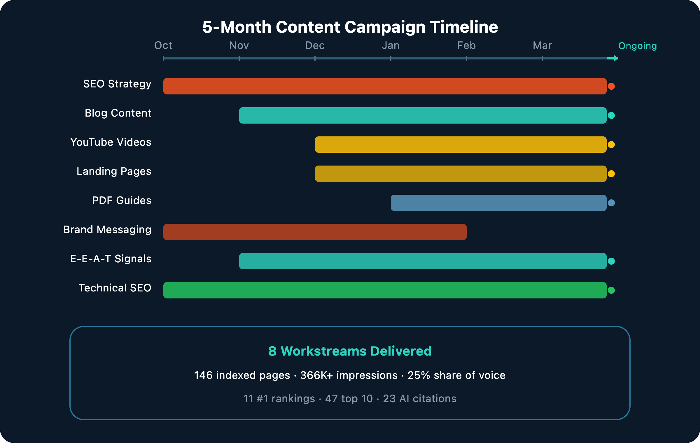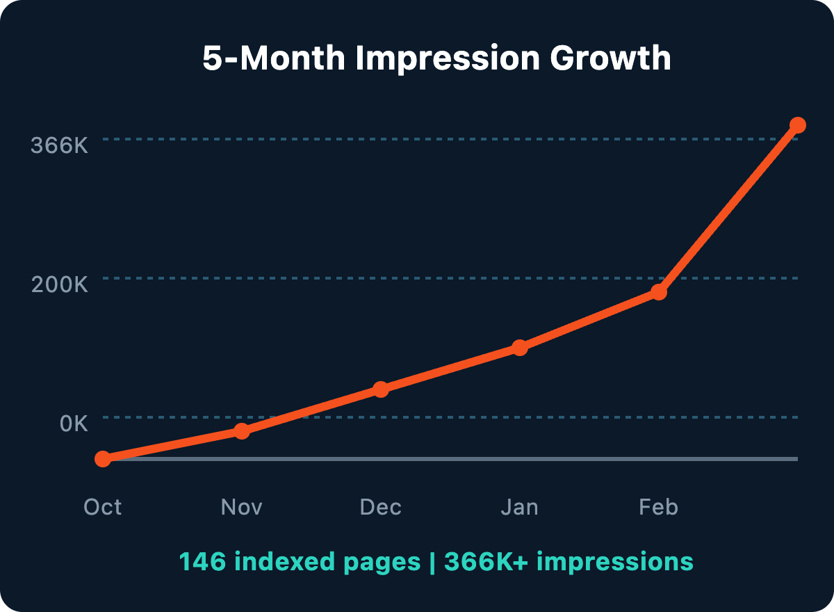 Five months later: 366K+ impressions across 146 pages, 25% Share of Voice, and 11 #1 Google rankings. From nothing.