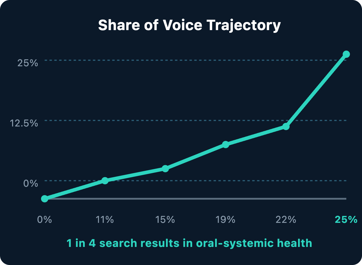 TDMC now owns 25% of the search conversation for tracked oral-systemic health topics. The climb was steady: 11% in November, 15% in December, 19% in January, and 25% by late February. One out of every four search results in the space now belongs to TDMC. For a site that didn’t exist in search 5 months earlier, that’s a quarter of the market captured before competitors could react.
