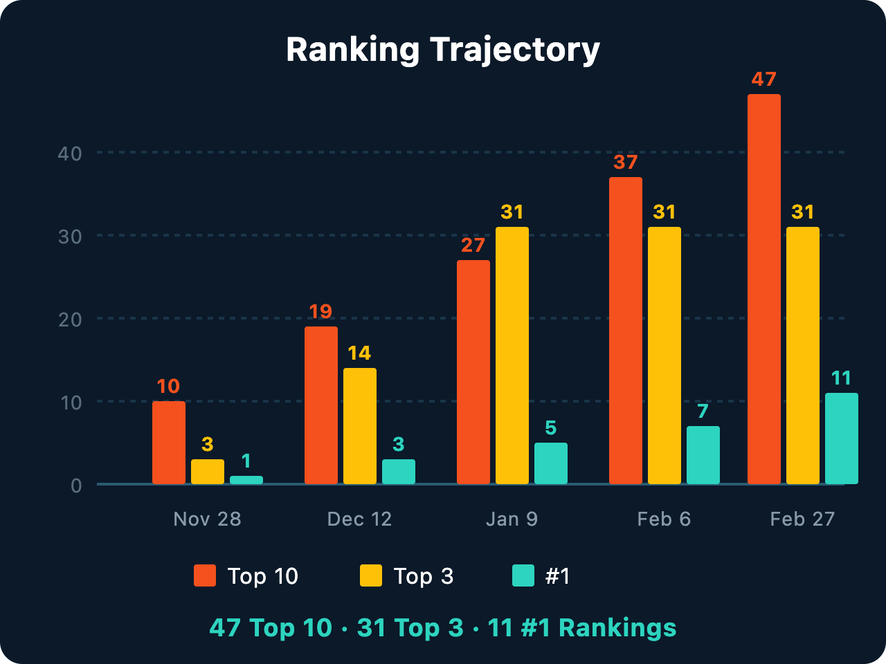 By late February 2026, TDMC held 47 Top 10 rankings, 31 Top 3 rankings, and 11 #1 rankings. The growth accelerated each month. Top 10 keywords nearly quintupled between November and February. Top 3 more than doubled in three weeks. And #1 rankings jumped from 3 to 11 in a single reporting period. Once Google started treating TDMC as an authority in oral-systemic health, the rankings compounded fast.